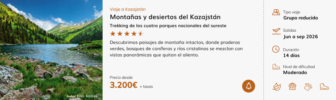 KAZAJISTÁN: Más amplio, más salvaje y, por momentos, casi desmesurado. Rarezas geológicas, estepas abiertas, y la presencia constante del Tien Shan. Kazajistán tiene ese punto de “aquí cabe medio planeta” que impresiona