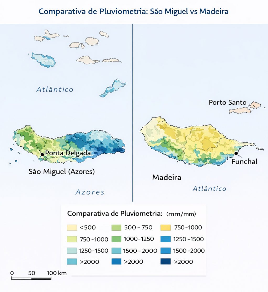 El mapa muestra claramente cómo São Miguel presenta una pluviometría más elevada y homogénea, con zonas más lluviosas que superan los 1.500 mm anuales, especialmente en el interior montañoso.
