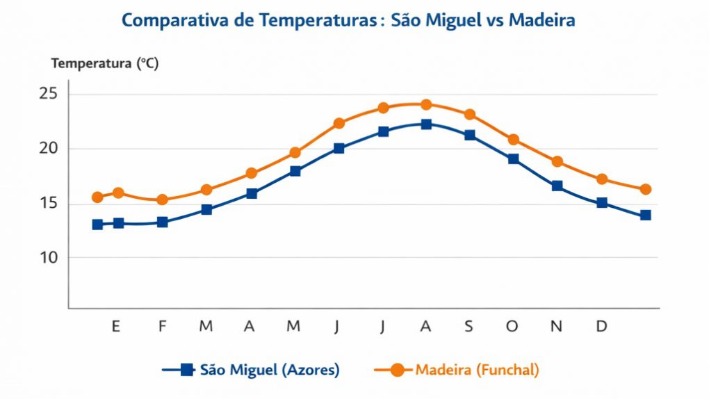 Madeira, en cambio, refleja un contraste más marcado entre el norte húmedo y el sur más seco, donde se sitúa Funchal.
