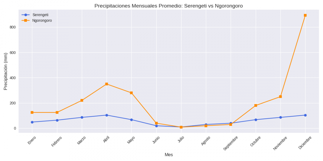 Las precipitaciones intensas de marzo a mayo y noviembre–diciembre alimentan los pastos que impulsan la Gran Migración, mientras que en los meses secos, especialmente julio y agosto, los rebaños se ven obligados a desplazarse en busca de agua y alimento.